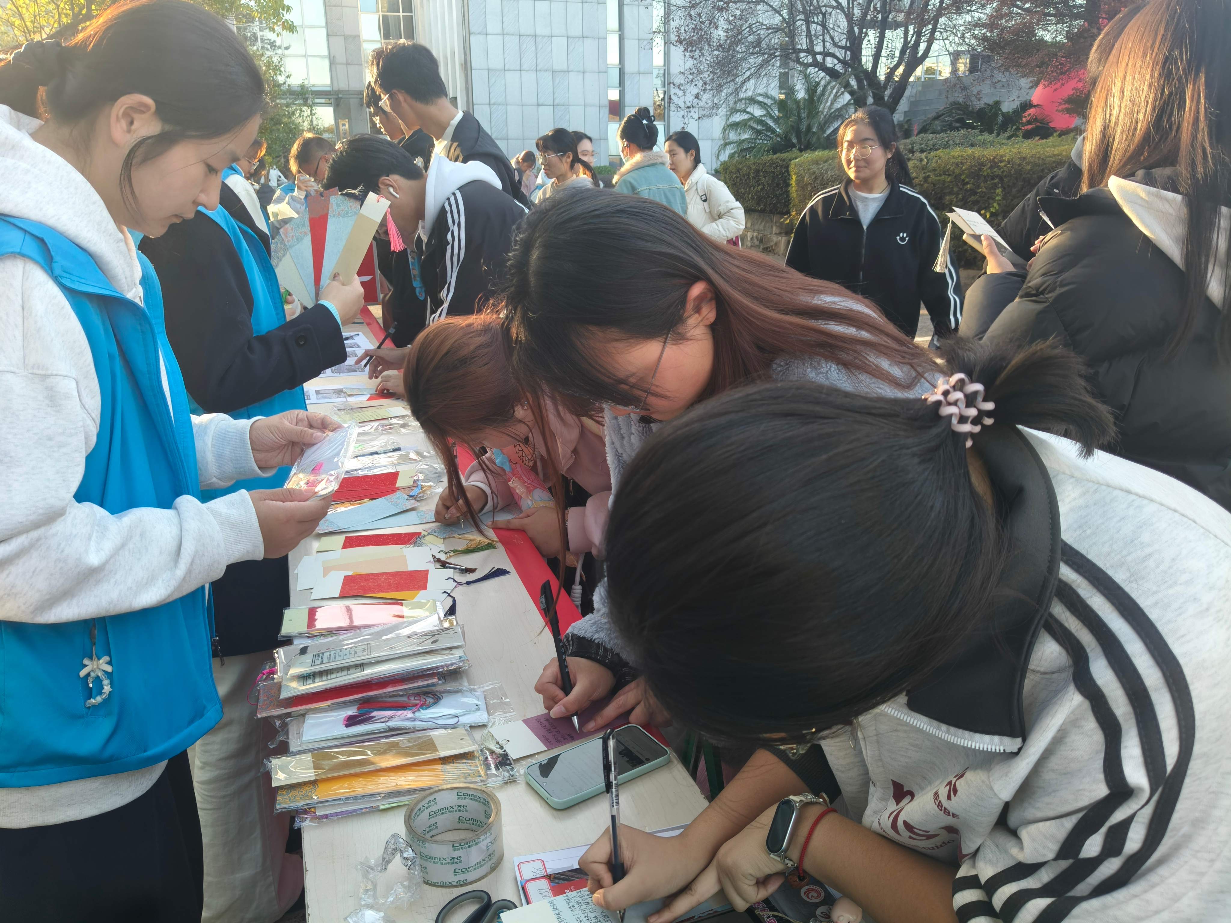 11月26 日,“文山书海,以书会友”活动在图书馆门口开展,学生在专属卡片上写下书籍推荐语与阅读感受,随后将卡片放入抽奖箱,再随机抽取其他同学的卡片,以此实现阅读心得的交流互换;同时,在易班优课中分享参与活动的感悟与收获。