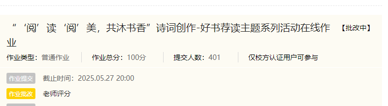 5月21日至27日,“‘阅’读‘阅’美,共沐书香” 活动同样依托易班优课课群为载体开展。活动要求学生结合自身生活阅历与诗词知识,进行诗词创作,并分享读书感悟及生活点滴,最终将相关内容整理成文档提交至在线作业。活动不仅有效激发了学生的创作热情,更引领学生在文字创作中深化对阅读的热爱,体悟文字背后的温度与力量。