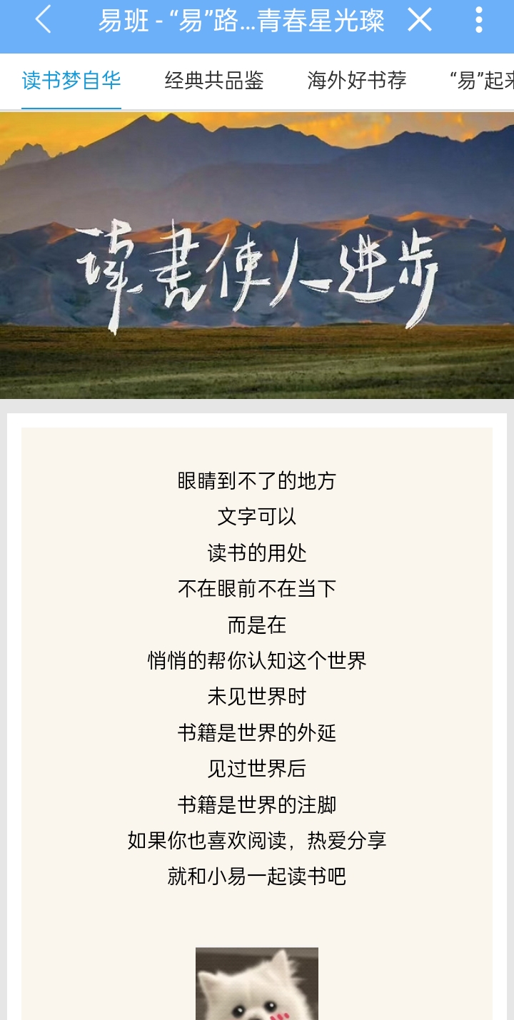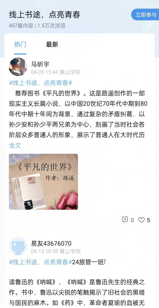 4月10日至14日,“线上书途,点亮青春” 好书荐读分享活动率先启动。活动依托易班轻应用与“瞄活动”平台,为学生搭建起便捷的线上交流渠道。学生可通过浏览活动轻应用获取优质书籍推荐信息,并参与评论互动;同时,在“瞄活动”话题区分享个人阅读感悟与心仪书籍。活动期间,学生们热情高涨,踊跃参与,话题区累计留言超百条,有效营造了线上阅读交流的良好氛围。