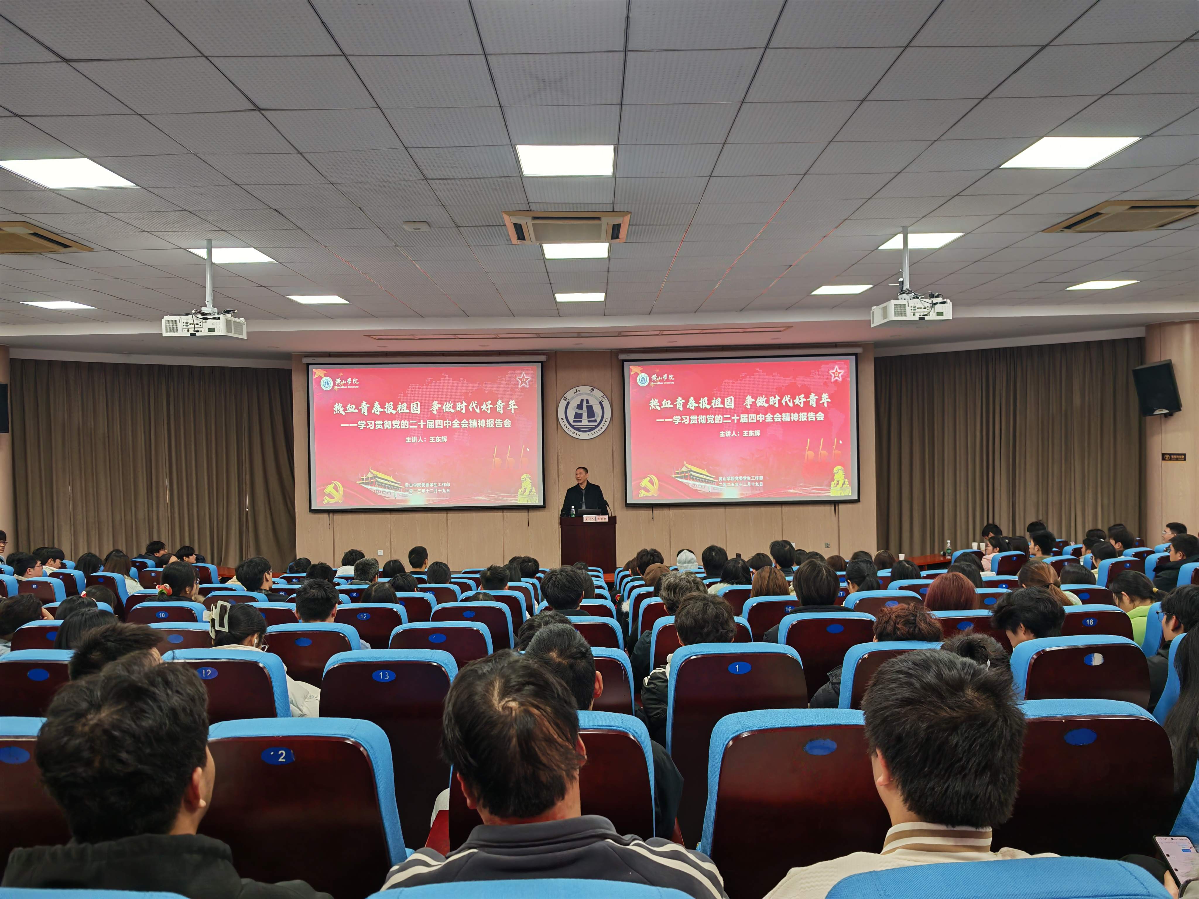 12 月 19 日下午,我校在文端楼报告厅举办学习贯彻党的二十届四中全会精神报告会。报告会特邀蚌埠工商学院党委学生工作部部长、退役军人王东辉教授担任主讲。各学院征兵工作联络员、班级思政委员及入伍意向学生代表共计300余人参加了此次活动。