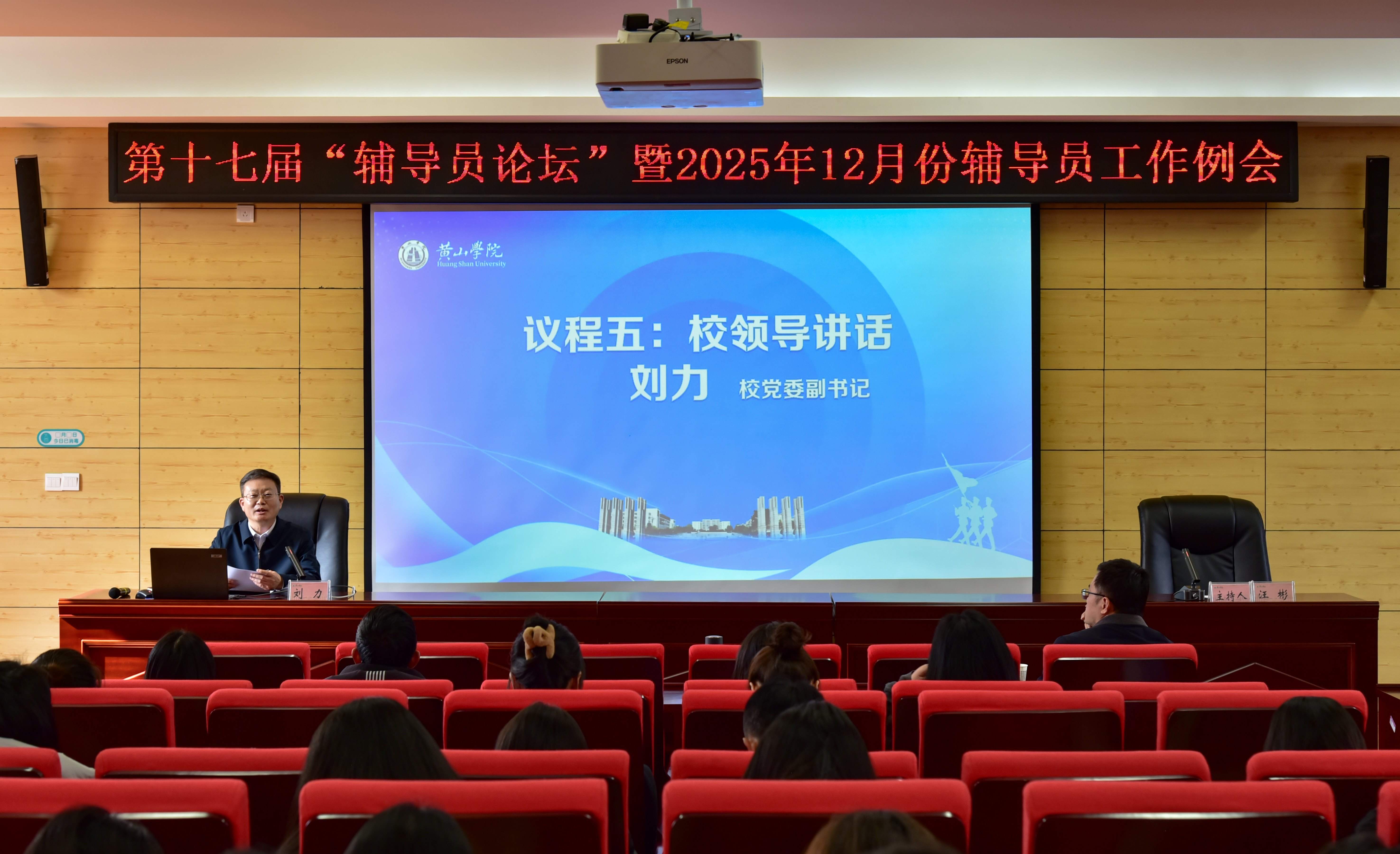 12月31日上午,我校在率水校区文昌楼南211会议室举办第十七届“辅导员论坛”暨2025年12月份辅导员工作例会。校党委副书记刘力出席论坛并讲话。校党委委员、宣传部部长汪恭艳、科研处处长汪洪峰、马克思主义学院党总支副书记(主持工作)廖荣军、安徽师范大学马克思主义学院教授朱平,学工部相关人员及全体专职辅导员参加论坛。论坛由学工部负责人主持。